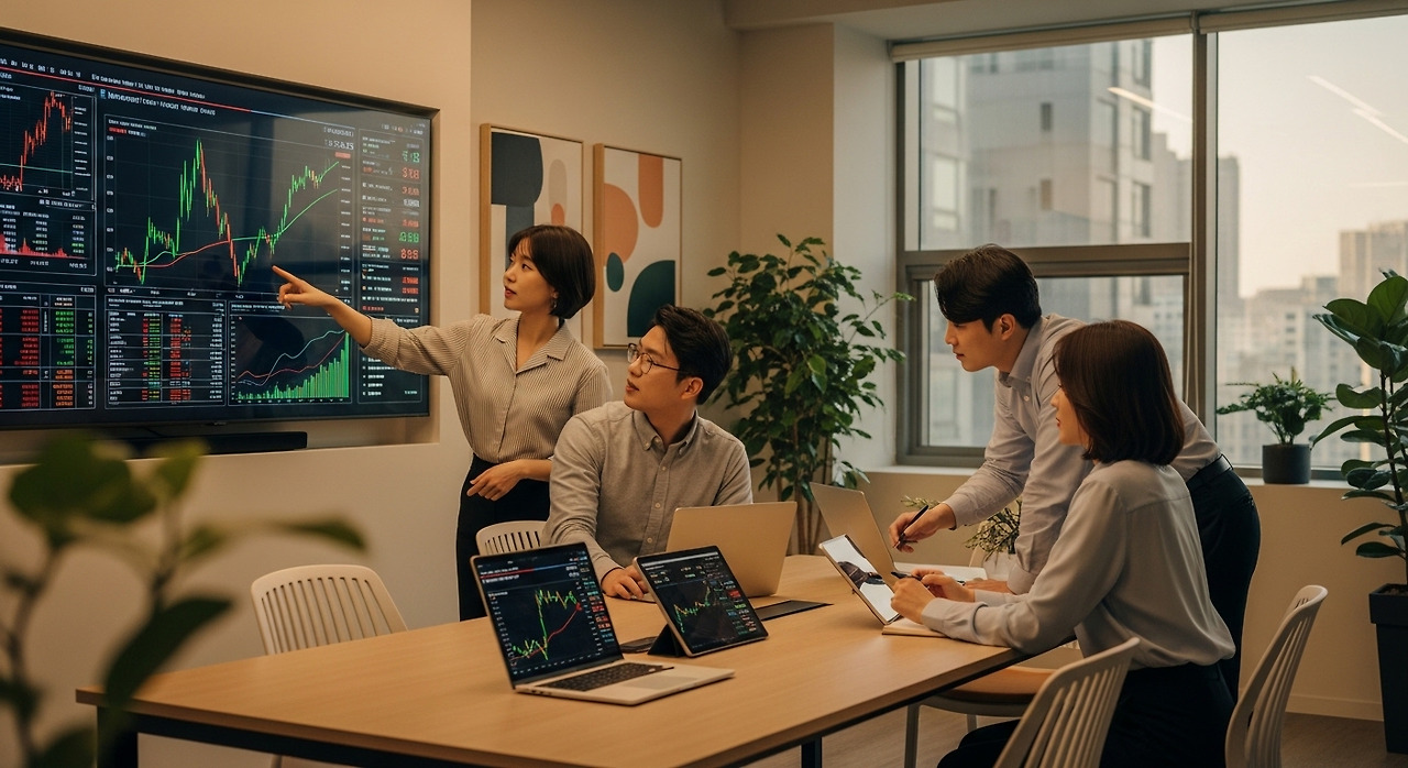 현대적인 한국 스타트업 사무실에서 젊은 전문가들이 투자 전략을 논의하는 모습, 디지털 스크린에 그래프가 표시된 집중적이고 협력적인 분위기