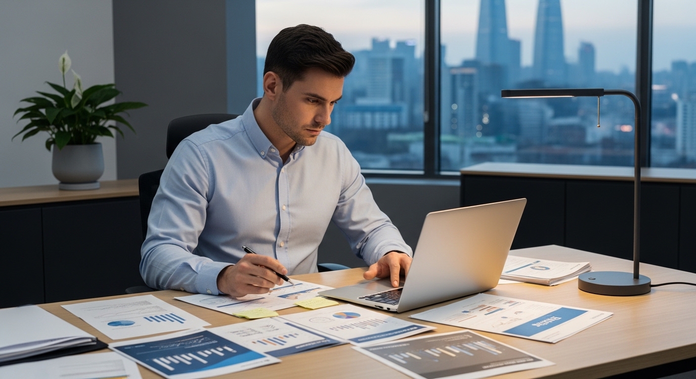 젊은 직장인이 사무실에서 금융 서류를 검토하는 모습, 창밖으로 보이는 도시 경관