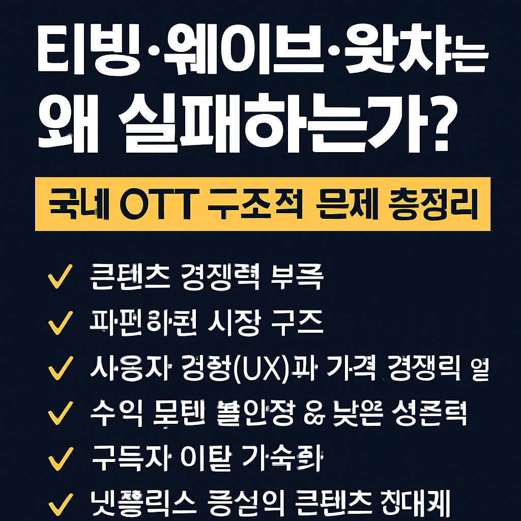 오늘은 이들 플랫폼이 왜 실패하거나 고전하게 되었는지, 그리고 국내 OTT 시장의 구조적 문제를 총정리해 보겠습니다.